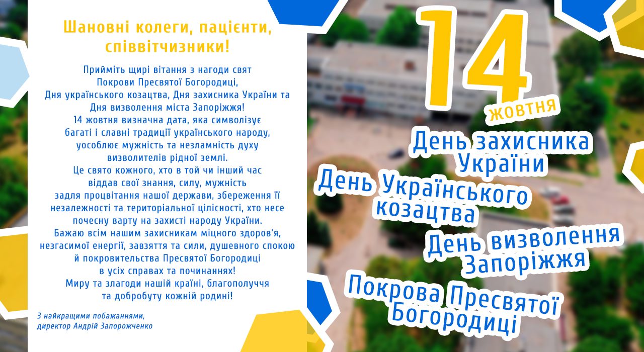 Привітання зі святами Покрови Пресвятої Богородиці, Днем українського козацтва, Днем захисника України та Днем визволення міста Запоріжжя!